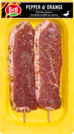 Saftiger Entenbrust-Spiess, mit Haut, für extra viel Geschmack. Perfekt gewürzt mit geschrotetem Pfeffer und Orange. Geeignet für den Airfryer.