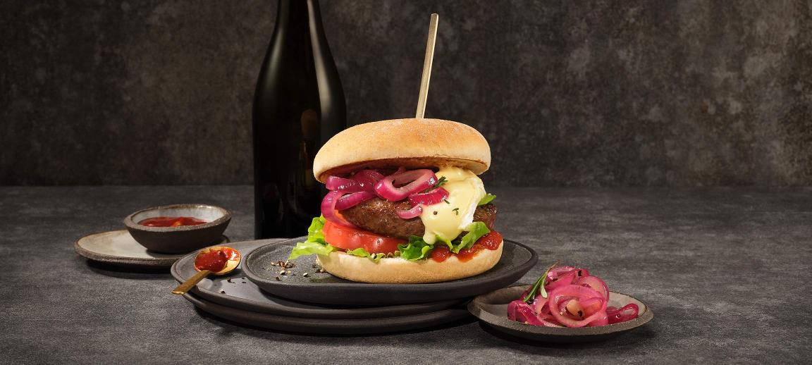 Beef Burger mit süss-sauren roten Zwiebeln, Avocado, Tomate und schmelzendem Camembert