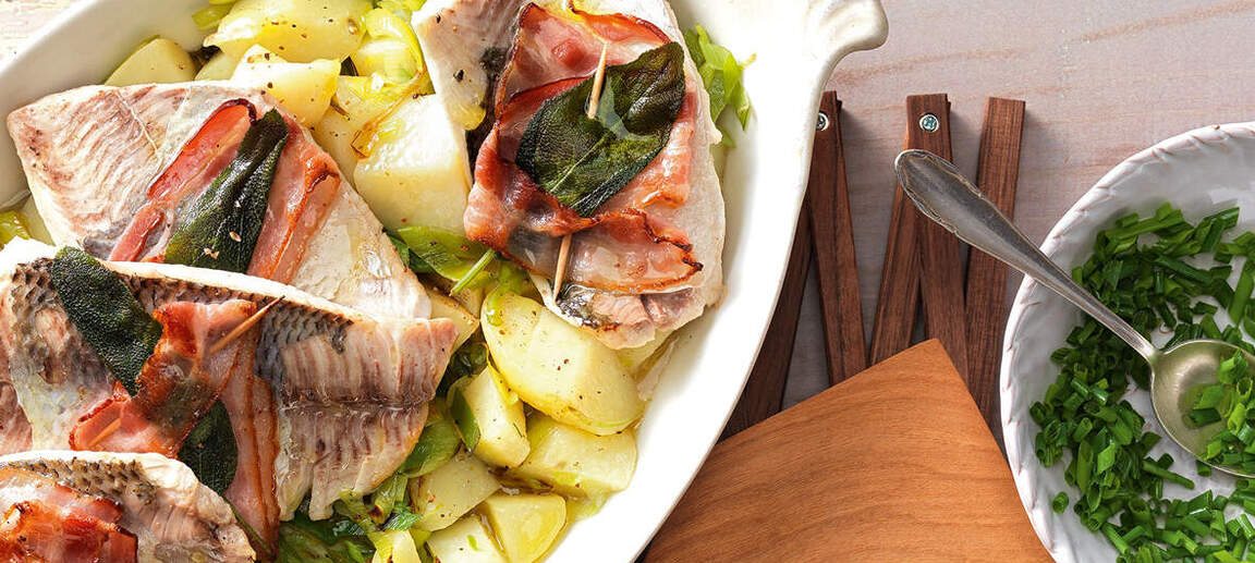 Felchenfilets mit Speck und Kartoffel-Lauch-Gemüse