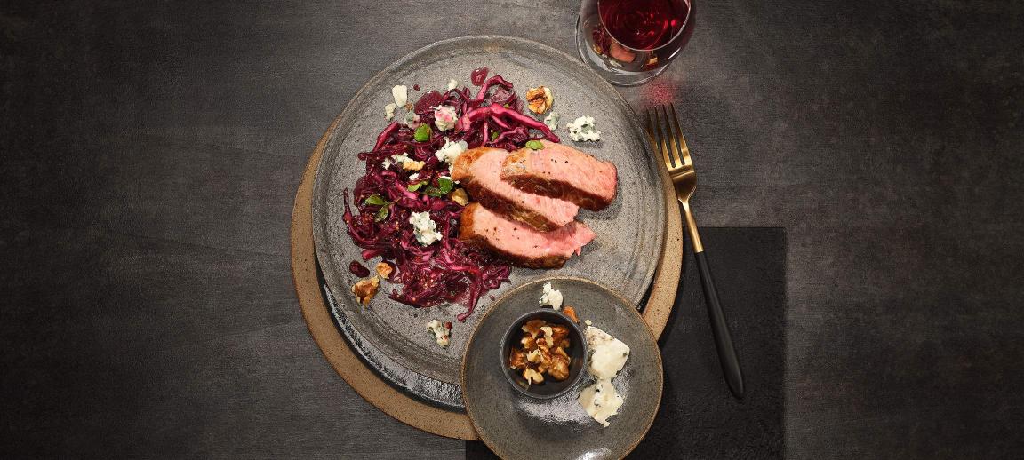 Kalbskotelett auf Rotkabissalat mit Blauschimmelkäse und Baumnüssen