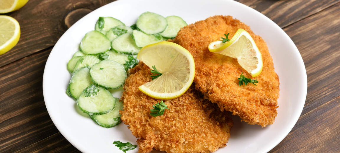 Schweinsplätzli mit Stockipanade und Gurkensalat