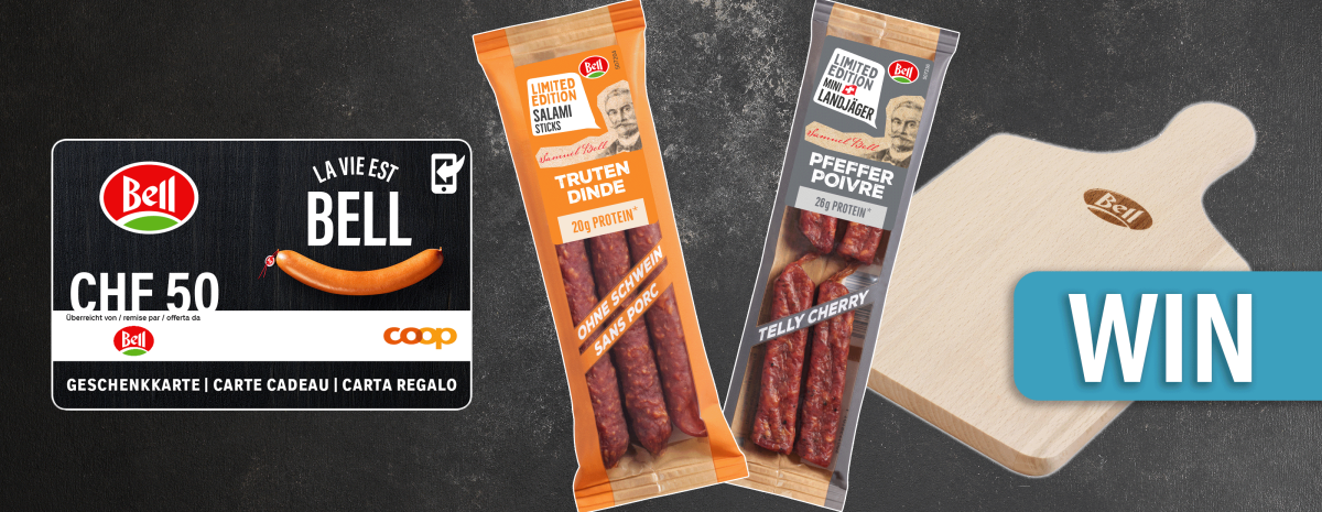 Snacke dich mit unseren beiden Neuheiten, den Mini Landjägern Truten und den Salami Sticks Pfeffer, durch den Winter und Frühling. Ein Bell Brättli und ein Gutschein im Wert von CHF 50 runden dein Paket ab.