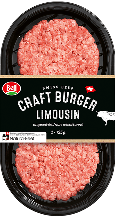 Bestes Schweizer Rindfleisch für die besten Burger. Unser Fleisch kommt von der Limousin-Rasse, die ihren Ursprung in Zentral-Frankreich hat. Die Mutterkuhhaltung und saftiges Gras garantieren erstklassige Qualität. Grob gewolft und ungewürzt für einen ehrlichen Beef-Geschmack!