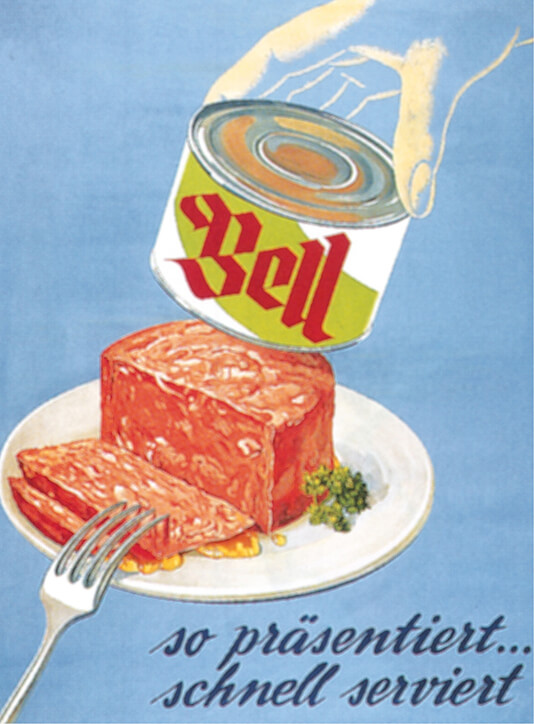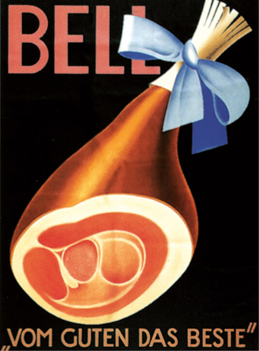 Né en 1896, le Bâlois Niklaus Stöcklin exprimait déjà des talents de dessinateur dans sa jeunesse. Sa virtuosité technique le prédestinait à l’art de l’affiche et au graphisme publicitaire. En 1923, il a créé pour Bell l’affiche intemporelle présentant un jambon à l’os orné d’un ruban - un motif typique du «réalisme magique». Utilisée jusqu’au début des années 1950, l’affiche fut modernisée en 1952 par Stöcklin lui-même qui ajouta le logo Bell de Paul O. Althaus. Une première dans le contexte de l’époque où il était plutôt rare de conserver si longtemps les mêmes sujets et de les mettre à jour.