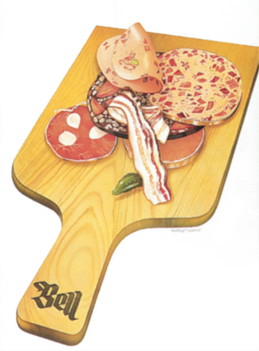 En 1940, Leupin a conçu l’affiche présentant une planche à découper en bois garnie de lard, de boudin, de charcuterie et d’un cornichon qui compte aujourd’hui encore parmi les affiches les plus célèbres de Bell. La diagonale est un procédé stylistique qu’utilisait déjà volontiers Niklaus Stöcklin.