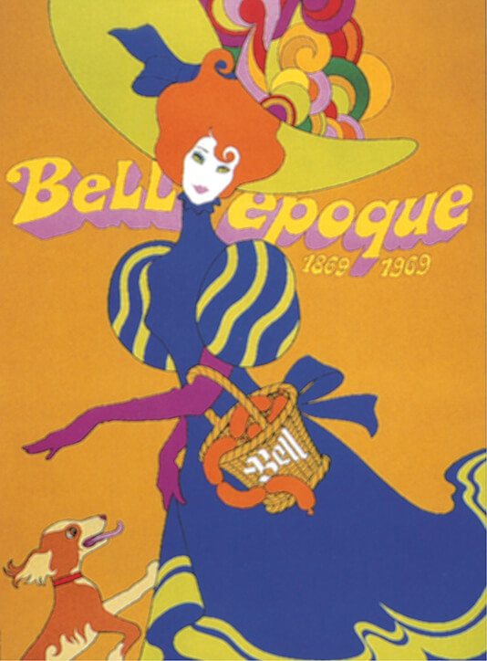 L’artiste Donald Brun réussit un véritable chef-d’œuvre pour les 100 ans de Bell en 1969. L’année était dédiée au thème «Bell époque». L’affiche en couleur de Donald Brun représentait une belle dame typique du 19e siècle, époque de la création de l’entreprise, accompagnée d’un chien à la langue pendante devant un chapelet de saucisses débordant d’un panier. Avec ses dégradés de couleurs bien tranchés que l’on retrouve tout particulièrement sur la coiffe multicolore et fleurie, cette affiche est caractéristique de son époque.