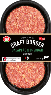 Un savoureux Craft Burger de la meilleure qualité suisse. Issu de viande de bœuf limousin de premier choix élevé sous la mère dans le respect des besoins de l’espèce. Tendre, juteux et d’un goût particulièrement intense. Agrémenté de cheddar jalapenos aromatique. Un régal hors du commun pour les authentiques fans de hamburgers !