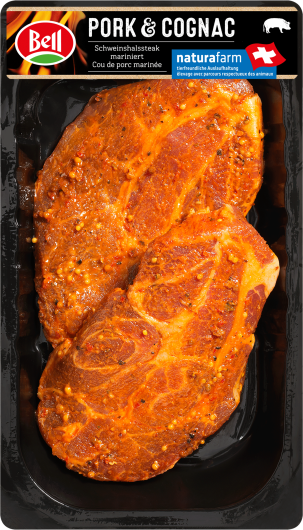 Un steak du cou de porc juteux de la meilleure qualité de viande suisse Naturafarm. Dans une marinade au cognac, miel & moutarde. La délicieuse marinade au cognac rehausse à la perfection le goût tendre et aromatique de la viande de porc.