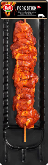 Une savoureuse brochette de la meilleure viande de porc suisse. De fines tranches nappées d'une marinade aromatique et piquées sur une brochette. Tendre et juteux. Un irrésistible régal !